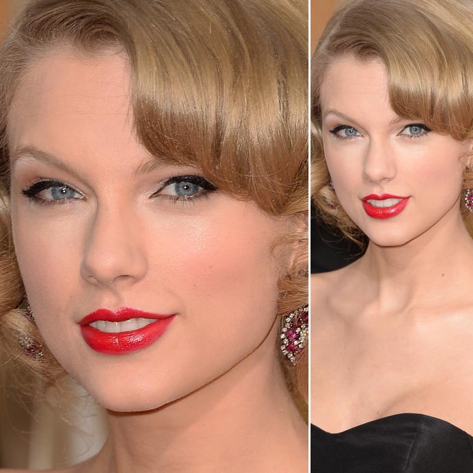 Taylor Swift foi com o clássico combo de batom vermelho e delineador. O básico que ela sempre usa e curte!