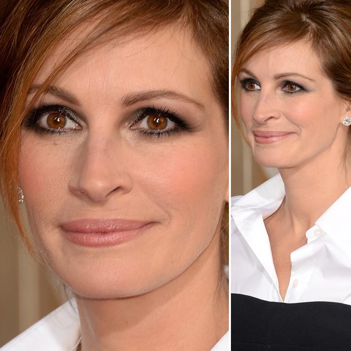 Julia Roberts caprichou no olho deixando ele bem pretinho e esfumado. Nos lábios e nas maçãs um tom suave de caramelo!