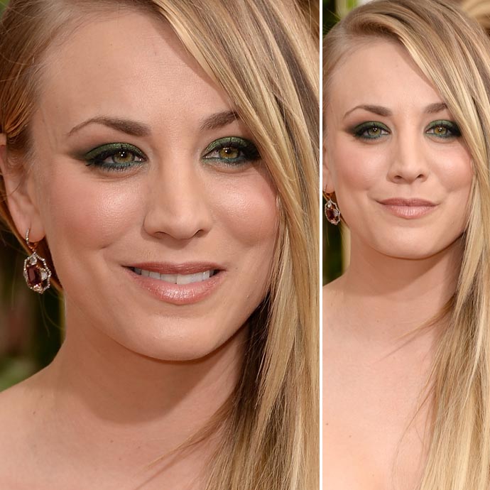 Kaley Cuoco já é o oposto, quase sempre maluquete nos makes. Dessa vez ela optou por um cat eyes com muito verde em cima e embaixo. Achei verdeeee demais, podia ter mixado com marrom/vinho e preto por exemplo. Mas ok, né? Saiu da zona de conforto.